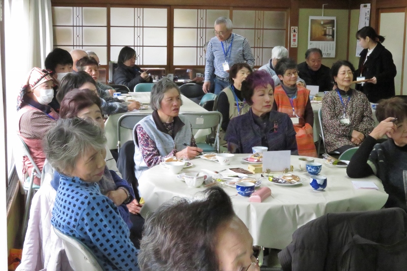 今回は10時30分から、健康と栄養「まごたちわやさしい」をテーマに管理栄養士の橳島(ぬでしま)静子さんにお願いしました。利用者・スタッフ合わせて約35名が、講義を楽しく聴きました。当日は、農協の行事と重なったようで、いつもの利用者の顔がみられず残念でした。